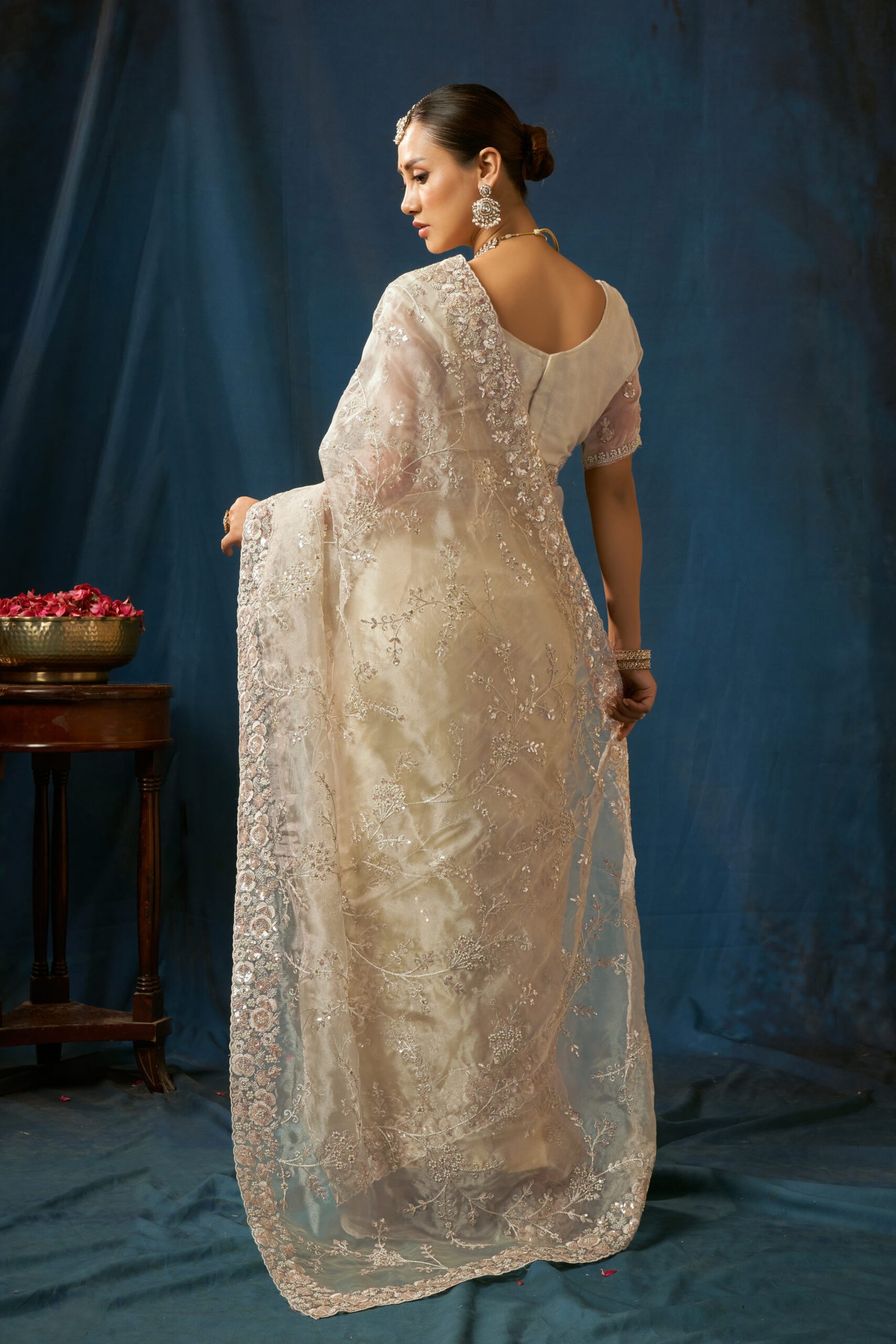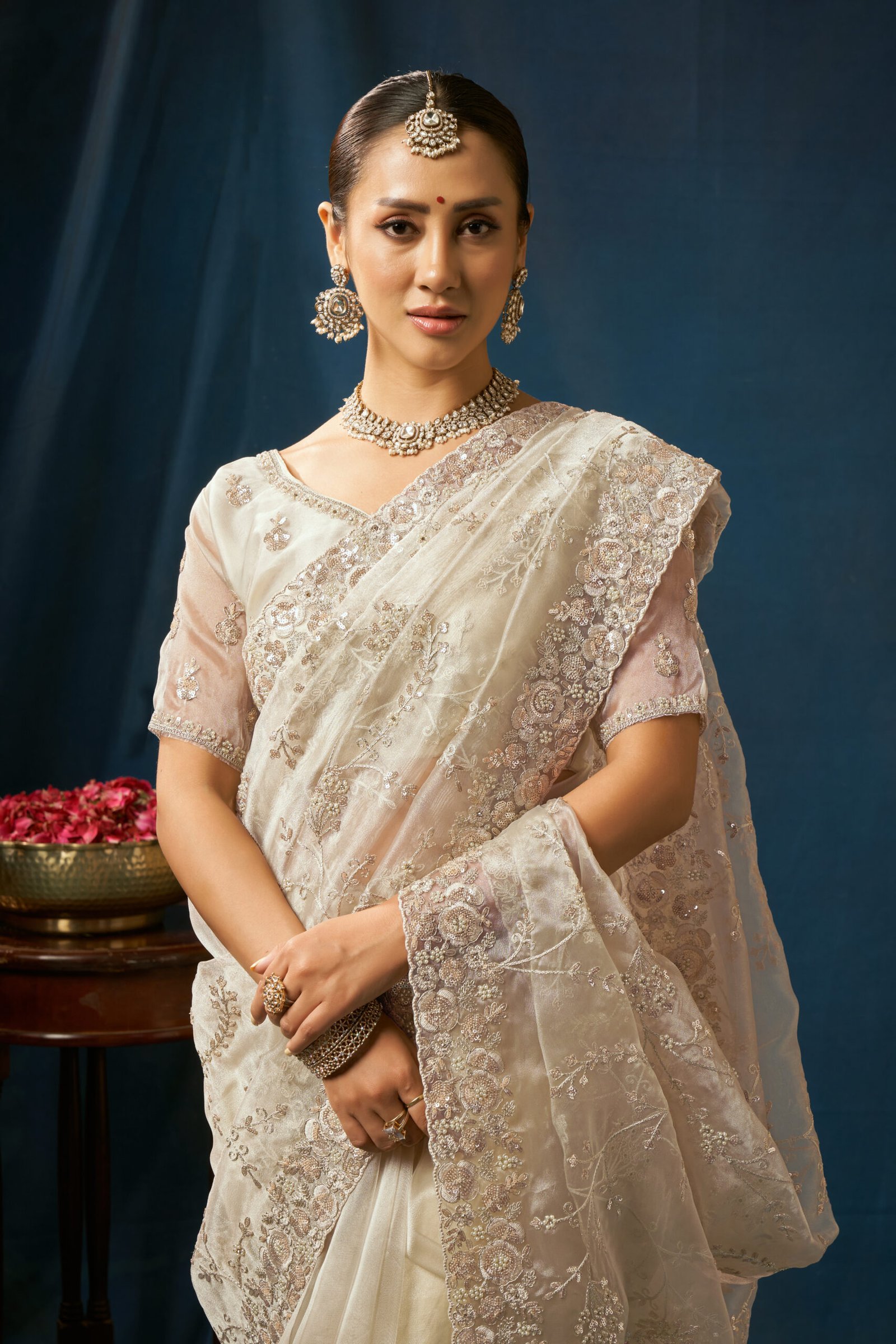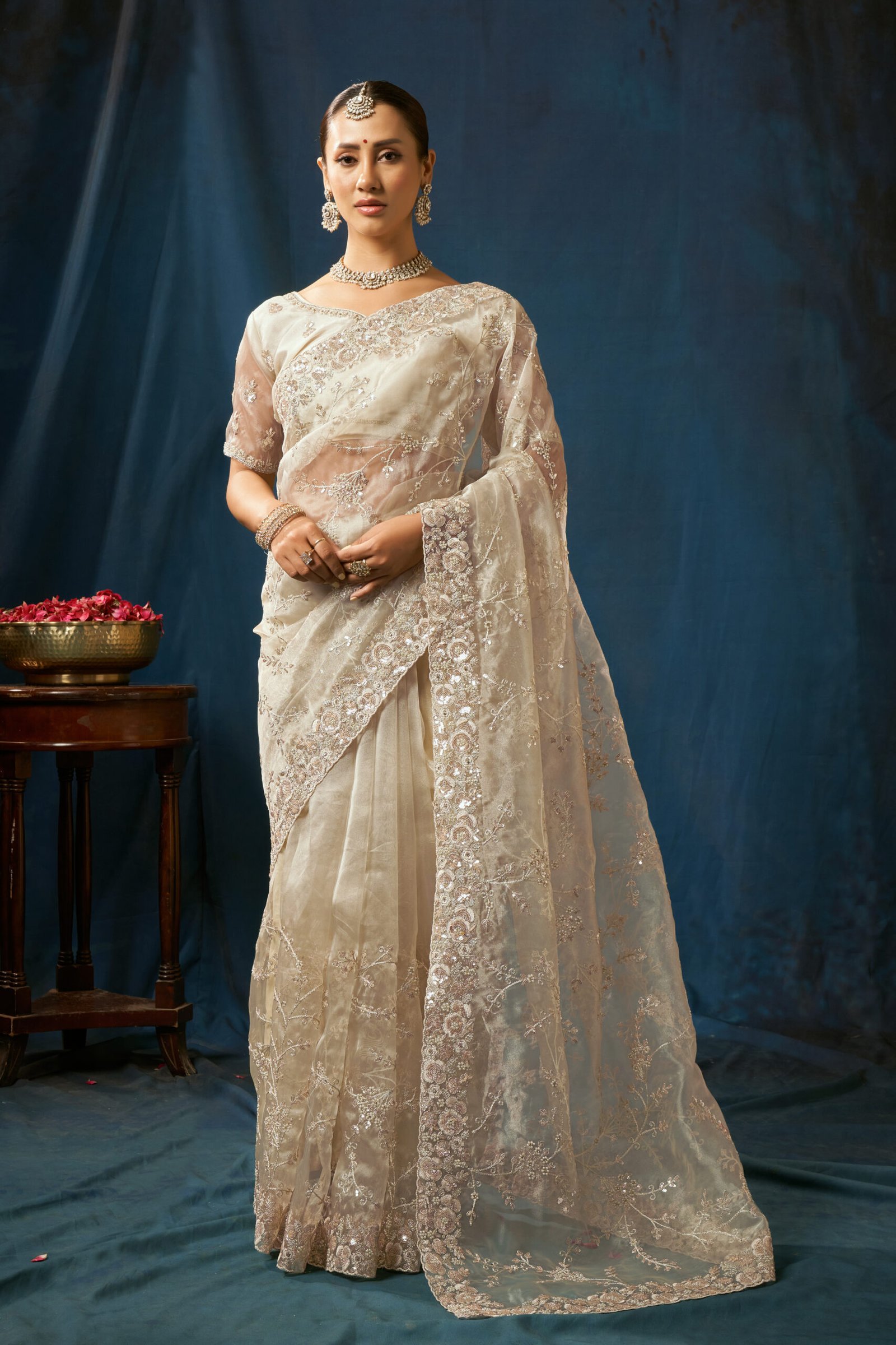Timeless Cream Saree with Beautiful Floral Embroidery