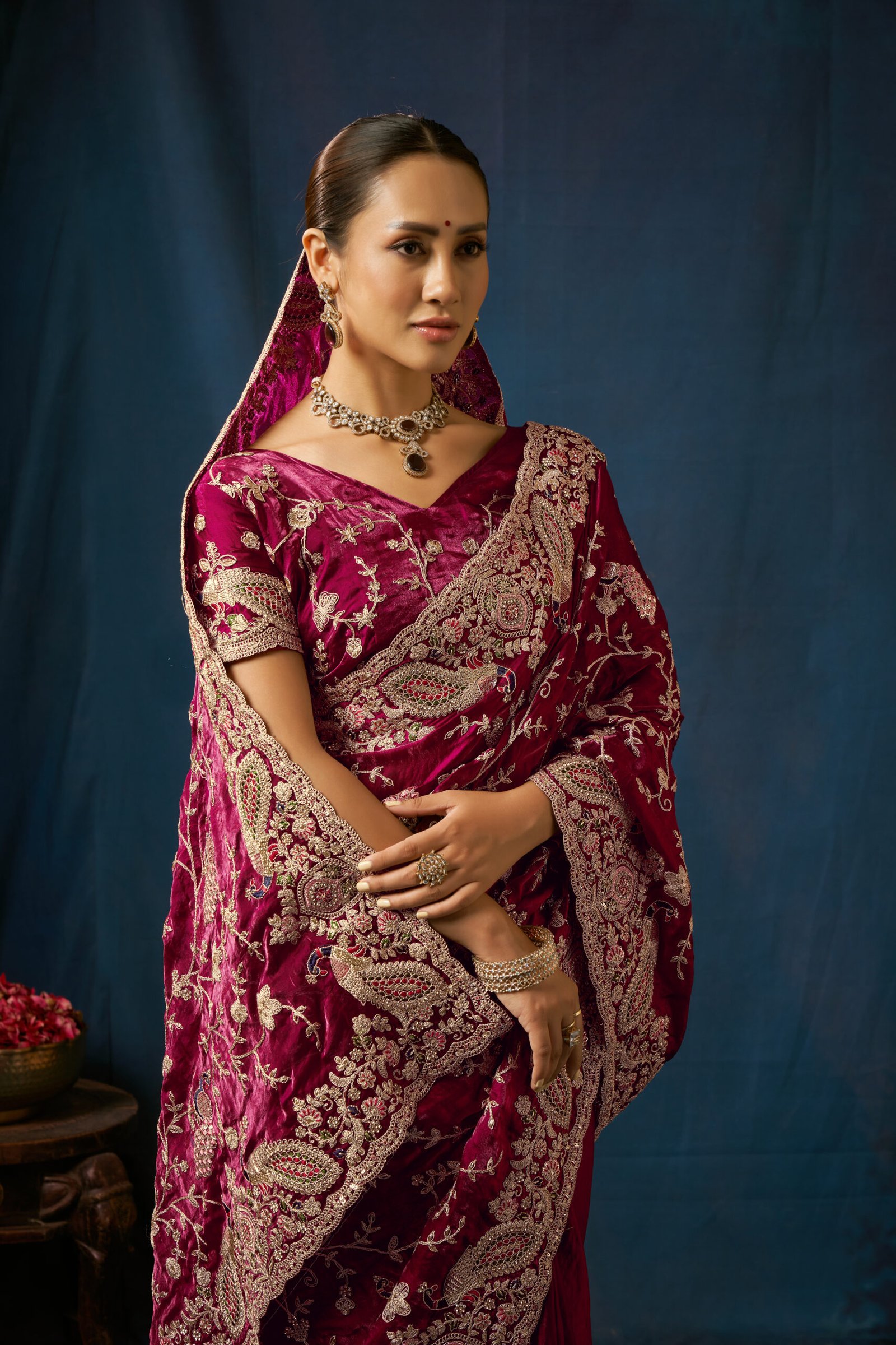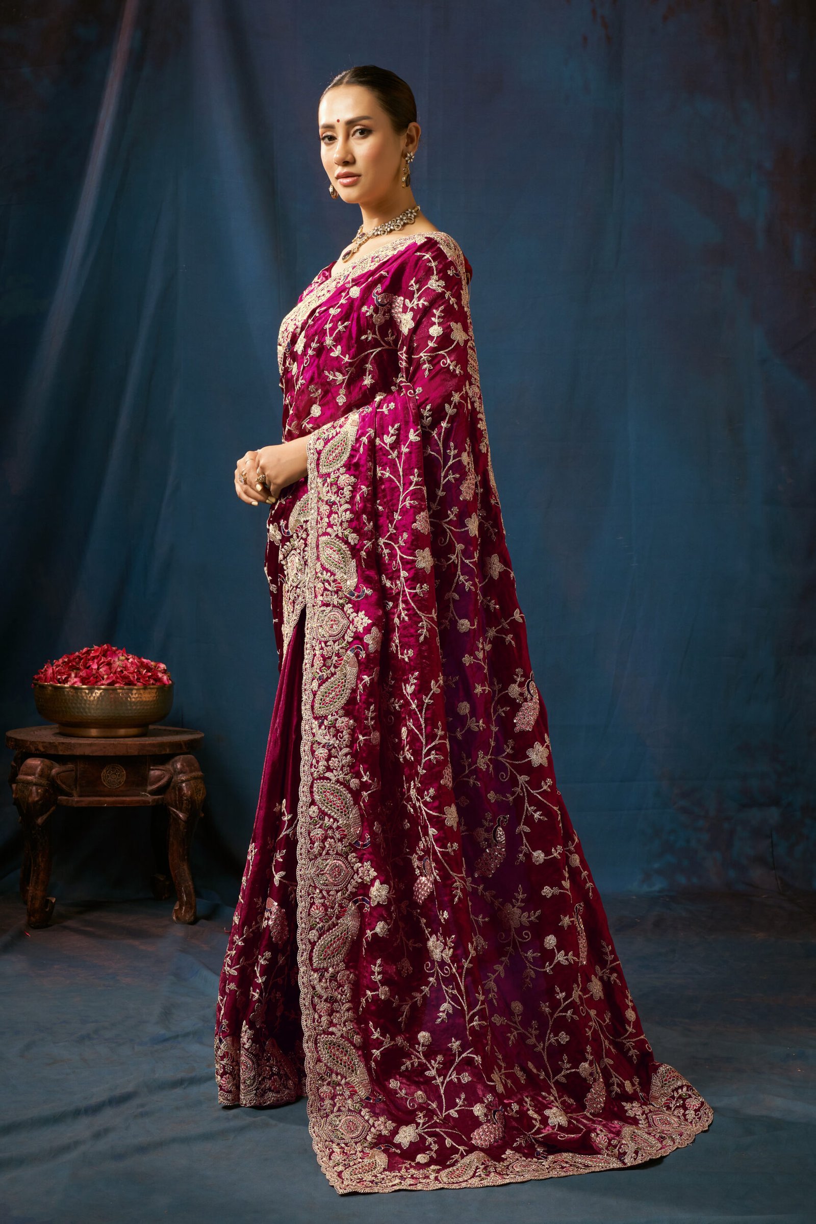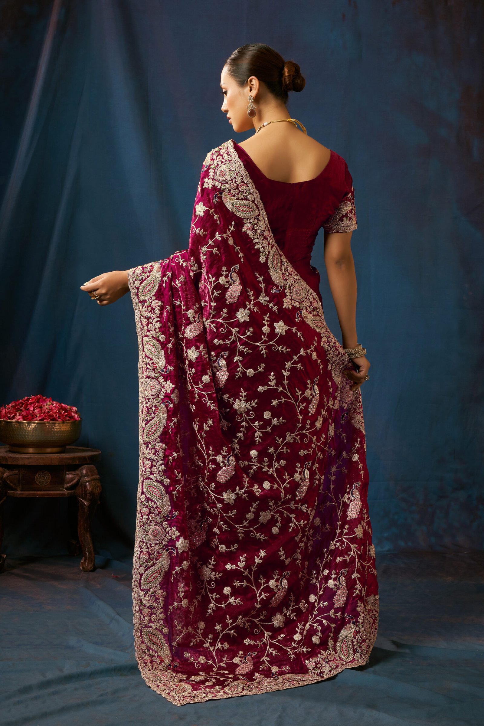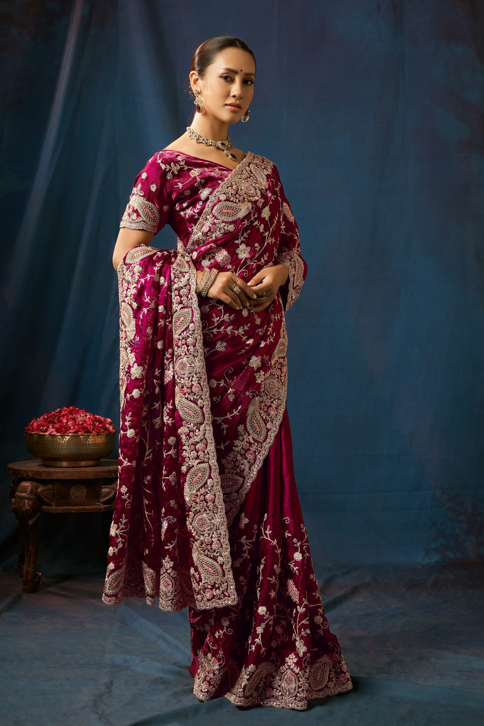 luxurious burgundy velvet saree, crafted with intricate floral and paisley embroidery. Perfect for weddings, festive occasions, and special celebrations, this saree blends traditional craftsmanship with modern style. The rich velvet fabric adds a regal touch, while the delicate silver-gold threadwork enhances its beauty, creating a stunning contrast.