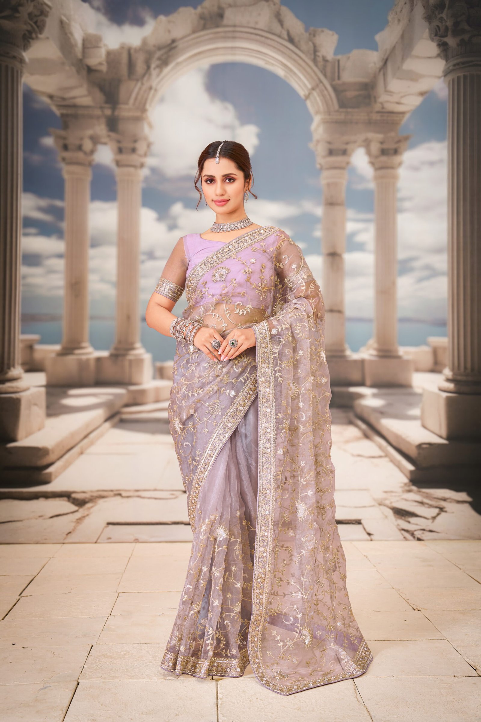Lavender and Fancy Floral Saree with Sequence Embroidery