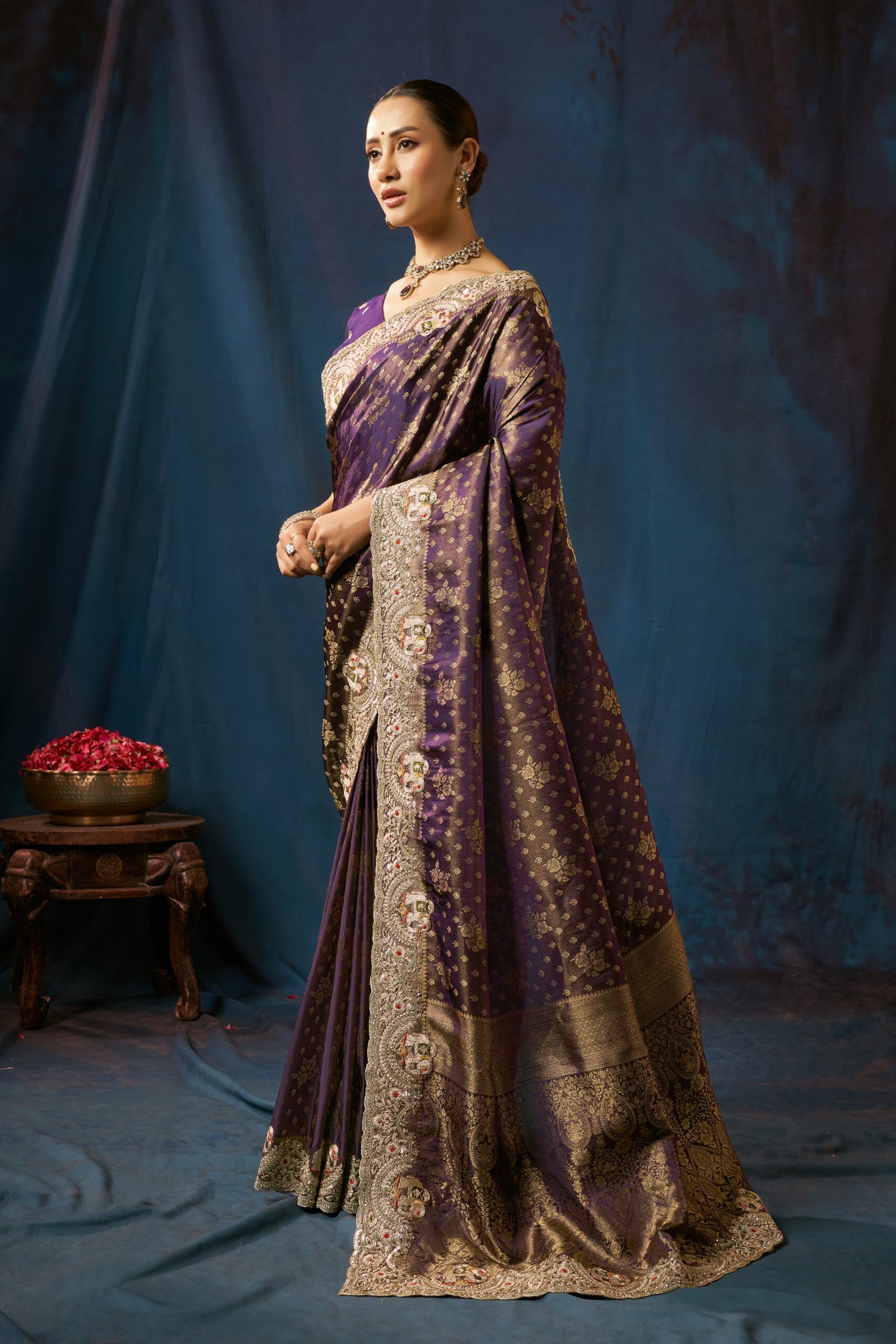 The rich purple silk base is elevated with golden butta weaves and ornate borders detailed with zari, resham, and antique motifs, reflecting the true heritage of Banarasi weaving traditions. Lightweight yet opulent, this saree drapes gracefully, giving you a look of royal sophistication.